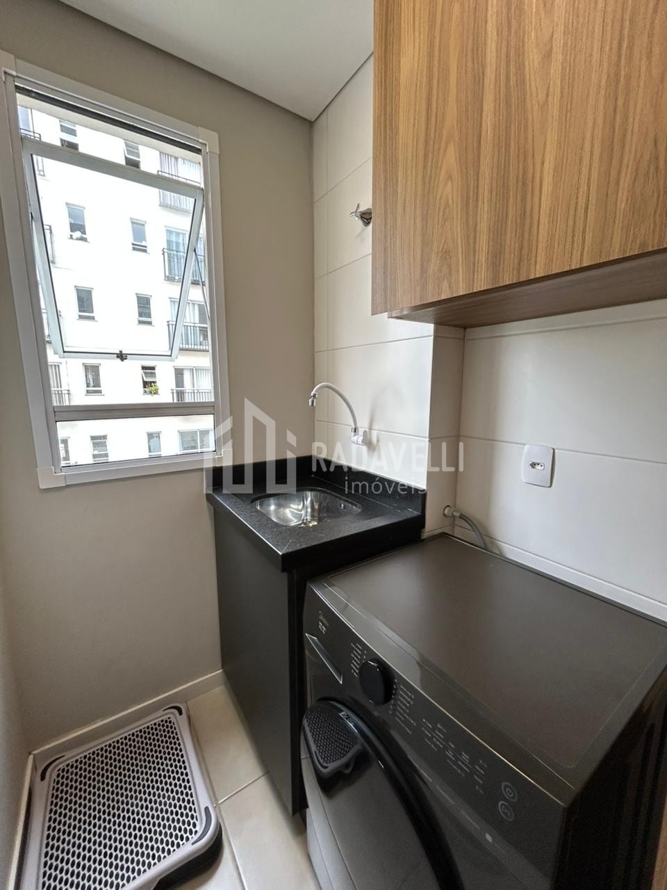 Lavanderia: móvel só medida, tanque e luminária.
