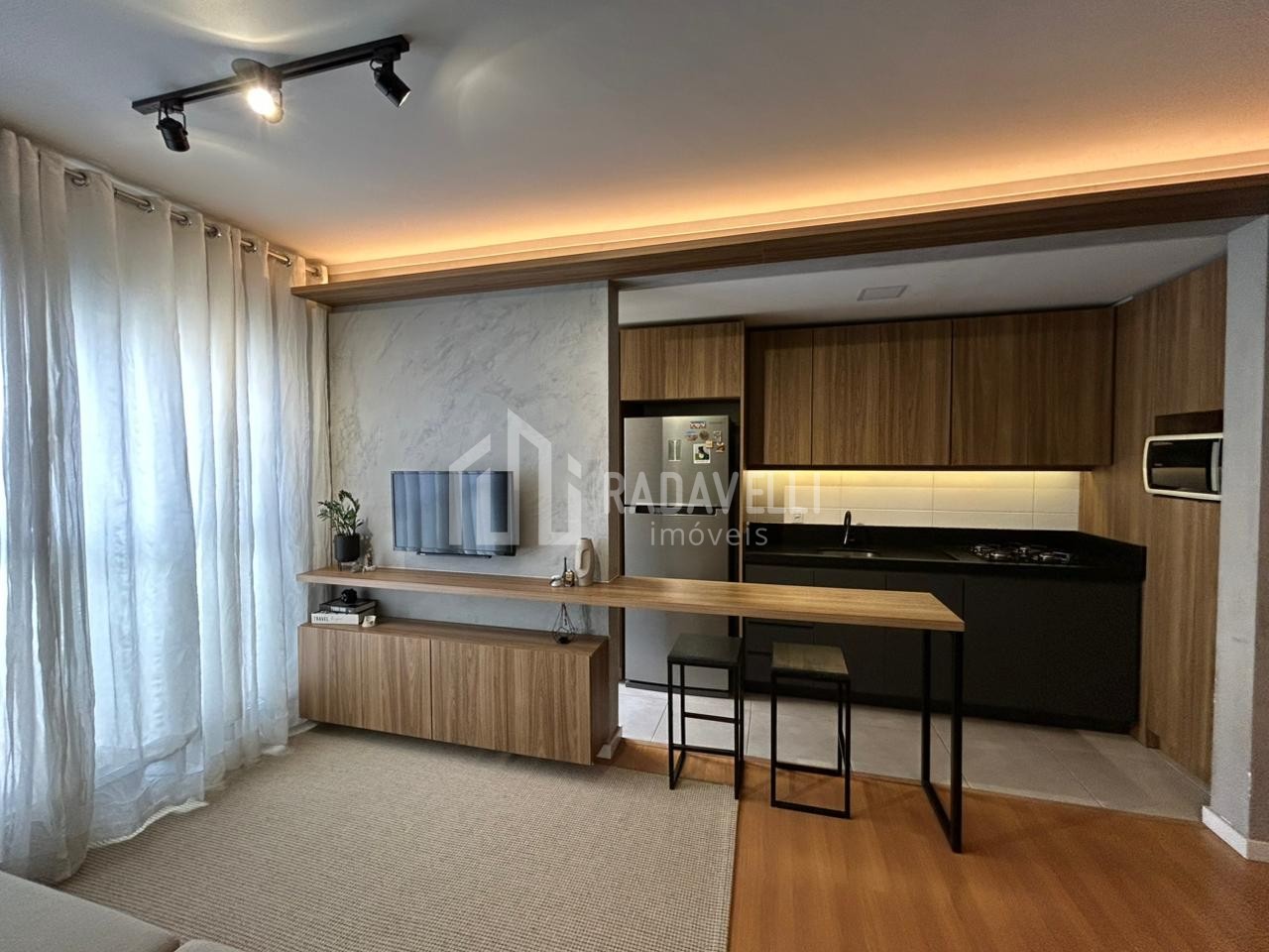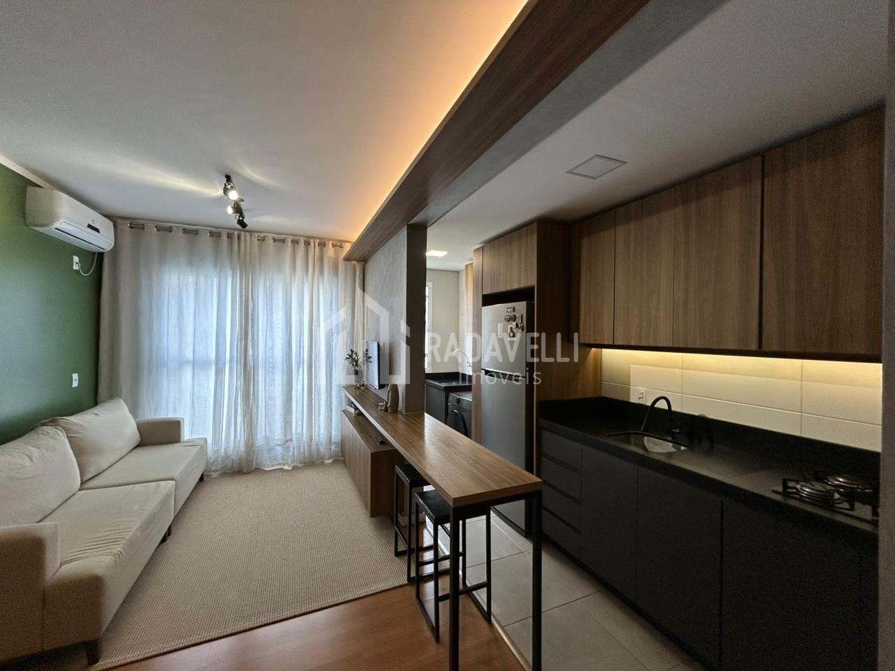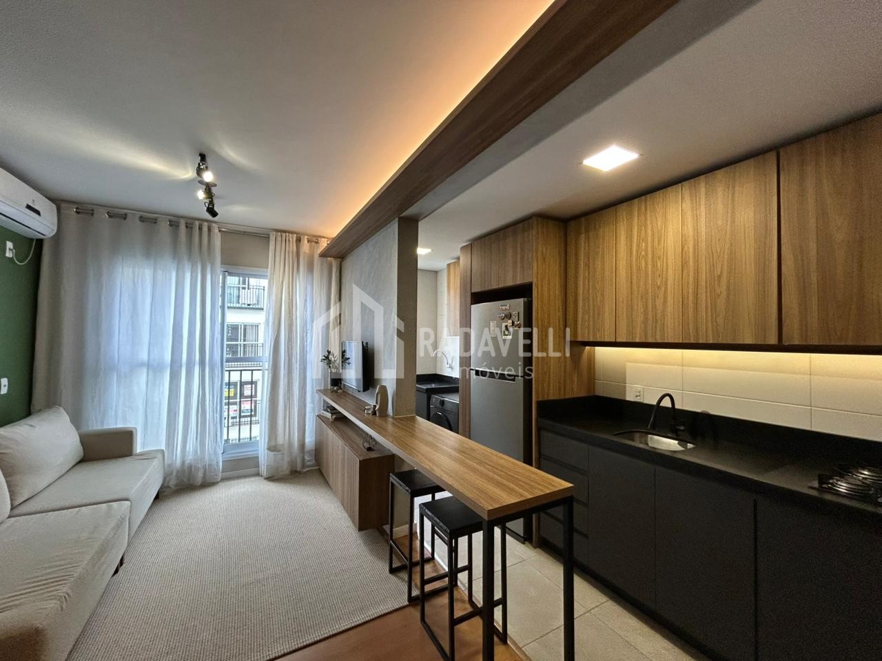 Sala de estar e jantar: móvel sob medida, cortina, canto alemão, mesa com cadeiras, luminárias e ar condicionado.