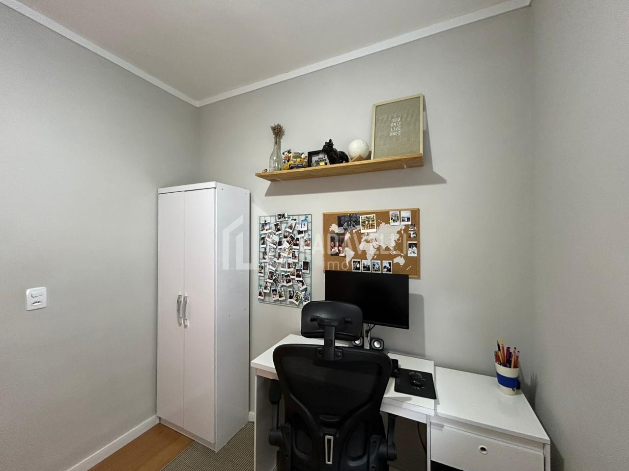 Quarto menor: escrivaninha, sapateira, luminária e guarda roupa.
