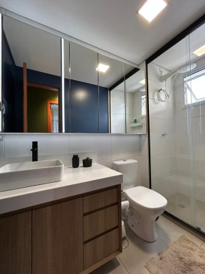 Banheiro: móvel sob medida, louça, box e chuveiro.