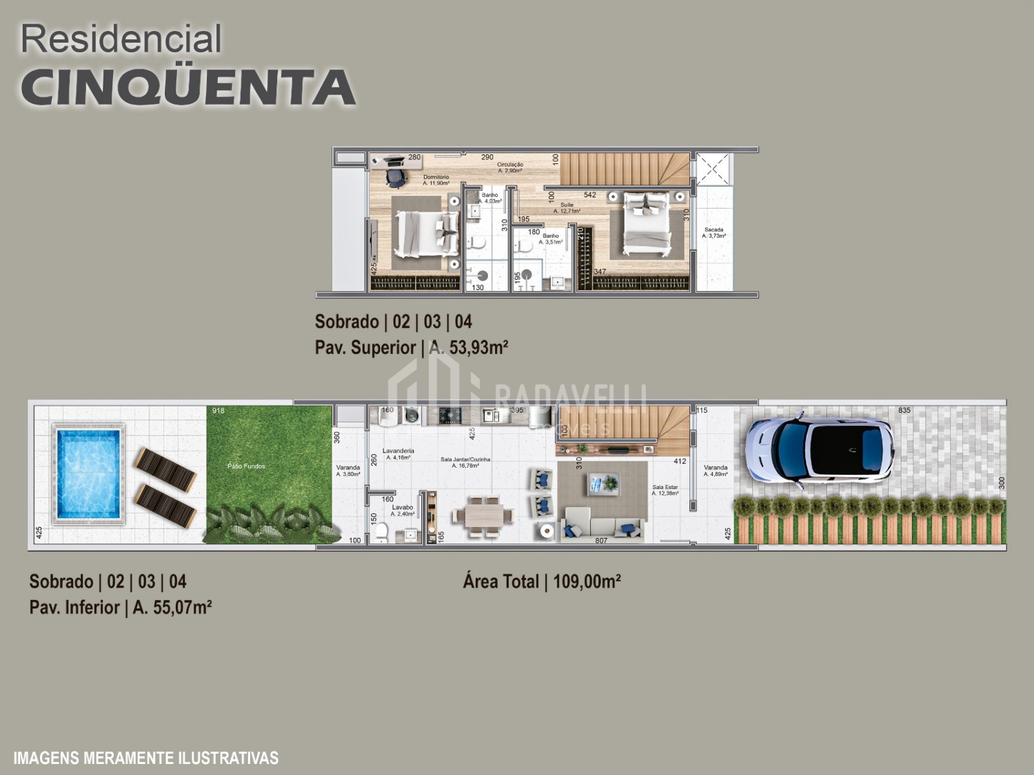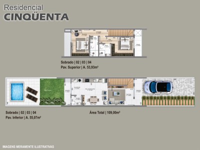 Sobrado Nº 02,03 e 04: Área de 109,00 m2, composto de 01 suíte com sacada + 01