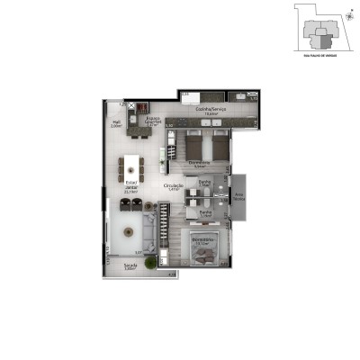 Apartamento 801 - Apartamento composto por 02 dormitórios sendo 02 suítes, sala de estar e jantar integrados, cozinha, área de serviço, 01 lavabo.